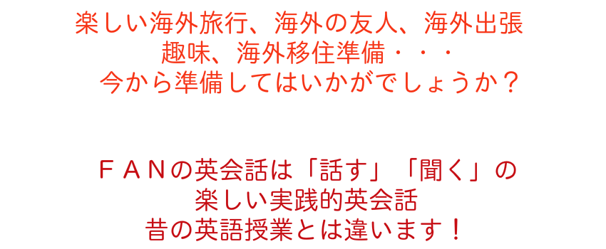 いつか英語を話したい!FANはその夢を叶えます。趣味、将来の旅行にも役立つ英会話授業。楽しさから生まれる最速の英会話授業が他のスクールと違います。