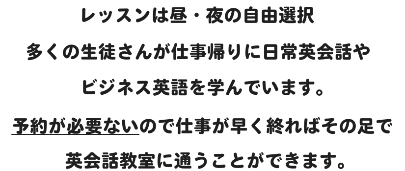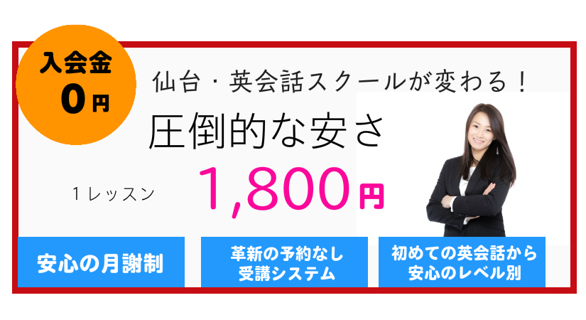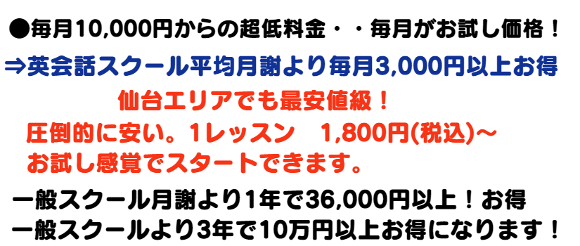 学生さん、社会人、主婦・・・仙台で英会話を習いたいけど毎日、不規則で習い事が難しい方の為にFANがあります。「予約なし」で「レベル別レッスン」に参加できるのはFANだけです。レッスン希望の当日、予約なしでレッスン参加OK!予約をしていないので、キャンセルも必要ありません。英会話を始めたい忙しい方におすすめです。