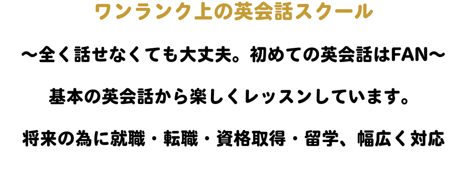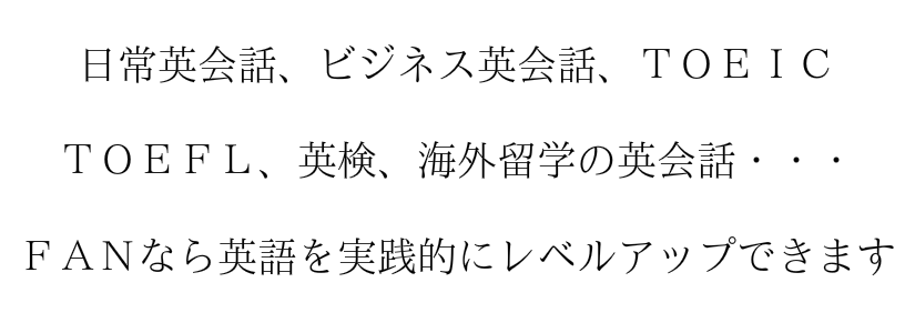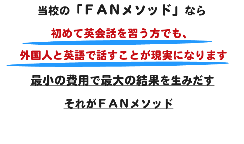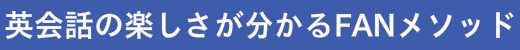 「FANメソッド」とはテキストだけに頼らず実践的に「聞く」「話す」を中心に英会話力を最速でアップする方法です。全くの初心者から安心。初歩から楽しいレッスンです。