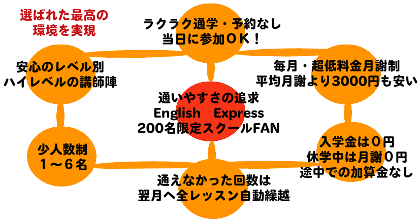 Q.英会話の上達は最低でも2000時間は必要と言われています。FANにはプレミアコースという、毎月「受け放題」のコースがあり、短期間で100時間以上のレッスンを受講して上達した方もたくさんいます。また、どうしても4回で上達したければある程度の期間が必要です。その為FANでは他校より格安の月4回11000円という月謝制が存在します。毎月の授業料の負担が少ない事は、継続する為には必要と考えています。 さらに、FANメソッドは話す練習が多いので教科書中心の他校に比べれば早期の英会話上達が見込めます。